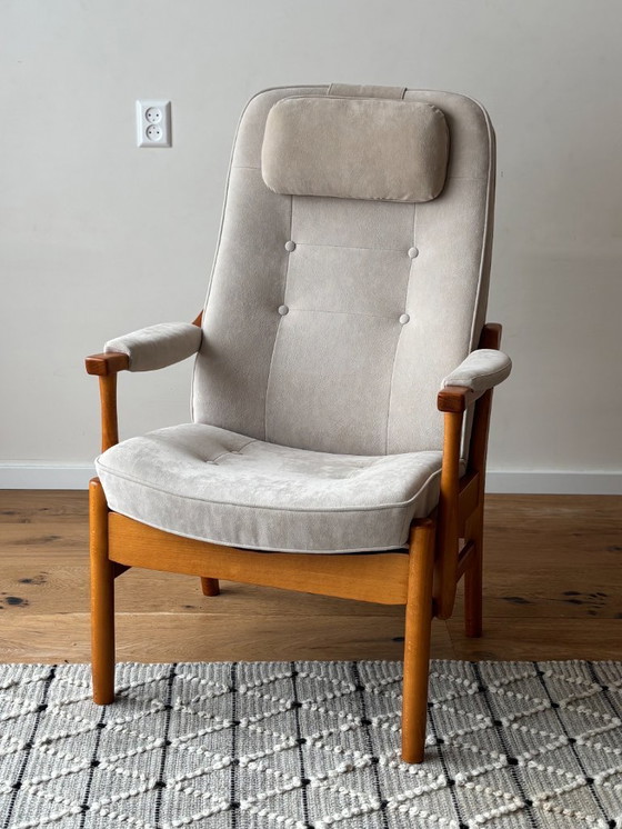 Magnifique et confortable fauteuil de relaxation senior de Farstrup, modèle 'Casa', au design scandinave intemporel. Le fauteuil est revêtu d'un tissu beige neutre, doux et luxueux. Son assise ergonomique et son dossier réglable offrent un confort et un soutien idéaux à long terme.