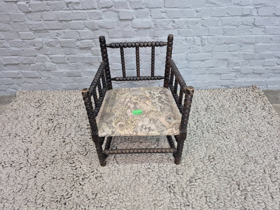 Fauteuil décoratif à boutons (ou à bobines) du début du XXe siècle, datant approximativement de 1920-1940. Ce fauteuil présente une structure en bois tourné caractéristique, composée d'éléments arrondis évoquant des perles, lui conférant une forte présence sculpturale et un toucher riche et agréable.