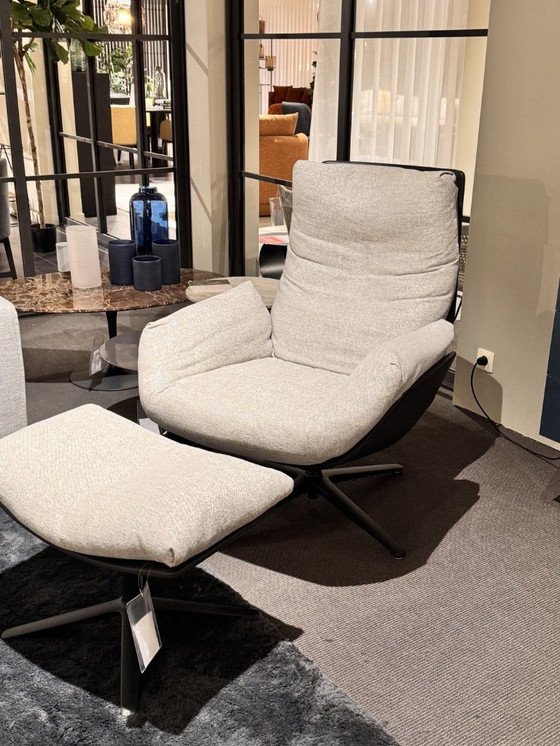 Élégant fauteuil Cordia Lounge de la maison de design allemande COR, avec son ottoman assorti.