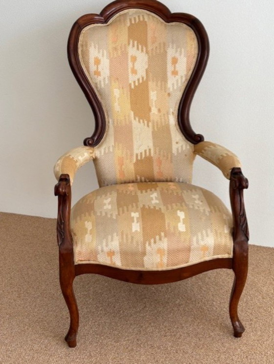 Découvrez l'élégance intemporelle de ce majestueux fauteuil Biedermeier. Avec ses lignes raffinées et son allure classique, ce fauteuil apporte une touche d'histoire et de raffinement à votre intérieur. Son revêtement en tissu beige clair à motifs discrets s'harmonise parfaitement avec le riche travail du bois des accoudoirs et des pieds. Un véritable hommage au style Biedermeier, reconnu pour sa simplicité, sa fonctionnalité et son esthétique raffinée.