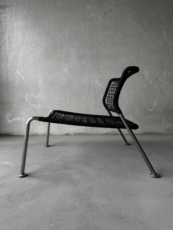 Fauteuil design Boconcept. Fauteuil en tube d'acier avec assise et dossier en fil noir, utilisable à l'intérieur comme à l'extérieur.