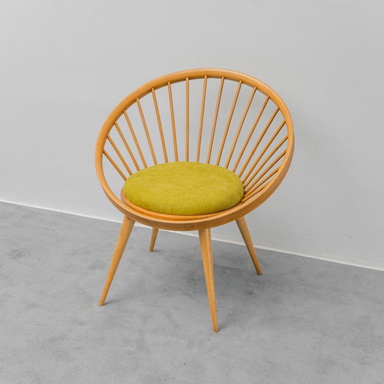 Fauteuil circulaire scandinave vintage années 60 en bois avec tissu vert, antiquités modernes