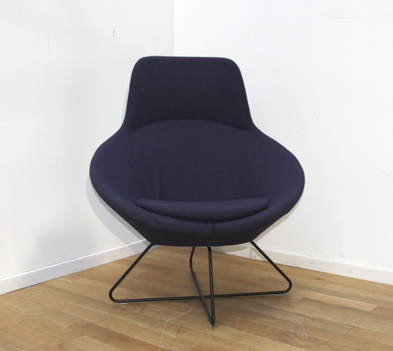 Fauteuil design Conic, Allermuir. Structure en métal teinté noir et assise en tissu violet. Design original. Hauteur d'assise 45cm. Parfait pour tous vos espaces de travail ou de maison.