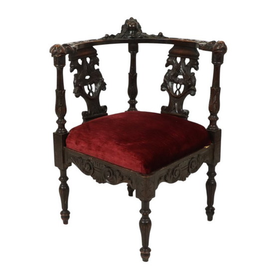 Fauteuil d'angle ancien en chêne sculpté, de fabrication italienne, entièrement de style Renaissance, seconde moitié du XIXe siècle, vers 1880.