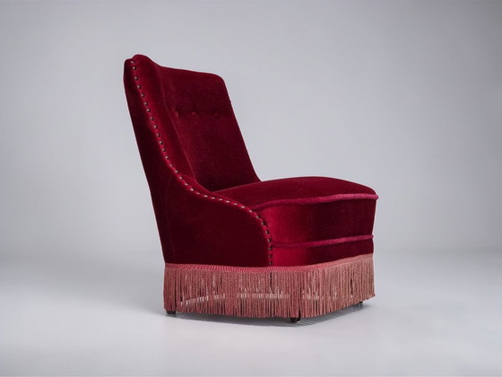 Fauteuil danois des années 1960, revêtement d'origine en velours rouge, pieds en bois de hêtre.