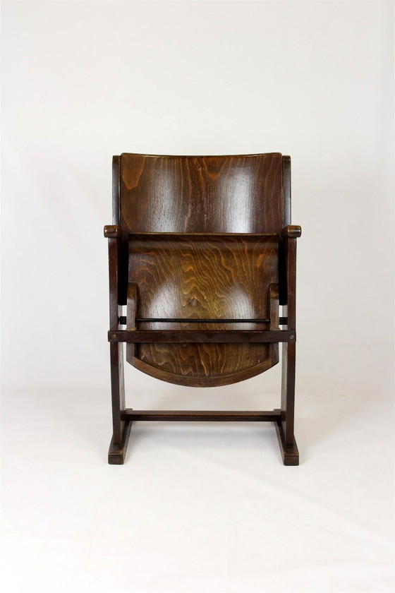 Fauteuil de cinéma vintage de la marque TON (anciennement Thonet), datant des années 1940-1950 et d'origine tchèque. Conservé en bon état d'origine, il présente une belle patine naturelle qui souligne le caractère du bois ancien et son authenticité. Ce modèle incarne le design fonctionnel classique du milieu du XXe siècle, avec une construction robuste et des lignes élégantes et minimalistes.