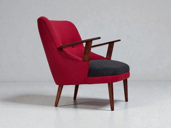 Fauteuil de conception danoise des années 1960. Entièrement rénové et retapissé avec de la laine d'ameublement de qualité, dans les tons rouge et gris. La structure en hêtre foncé a été rafraîchie et les ressorts de l'assise ont été conservés. Fabriqué par un fabricant de meubles danois entre 1960 et 1965 environ. Retapissé par un tapissier-artisan professionnel.