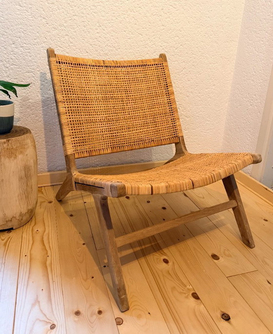 Magnifique fauteuil lounge artisanal en teck et rotin tressé. Originaire de Java, en Indonésie. Le fauteuil est neuf et dans son emballage d'origine.