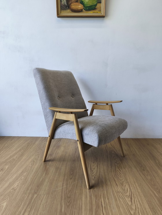 Fauteuil design conçu par J. šmidka, années 70. Désiré et recherché. Design tchèque classique. Fauteuil après un rafraîchissement complet. Nouveau rembourrage et nouveaux éléments d'assise. Bois rafraîchi. En raison de son âge, le fauteuil peut présenter des imperfections mineures malgré le rafraîchissement, mais il a définitivement son âme et sa chaleur qui donneront du cachet à n'importe quelle pièce.
