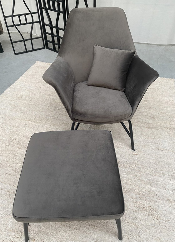 Fauteuil + coussin avec pouf par Dome Deco, couleur taupe/brun, tissu velours, dimensions 85 br x 88 h arrière, 40 h avant, 57 de profondeur, 40 de hauteur d'assise. Tabouret 52 x 52 x37 hauteur. Coussin 35 x 35.