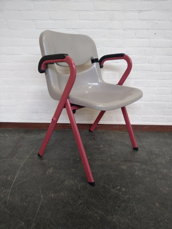 - Son assise élégante en plastique gris et son dossier à ressorts, complétés par des pieds en métal rouge vif et des accoudoirs noirs, créent un contraste visuel attrayant.