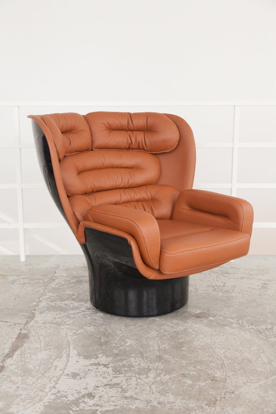 La chaise Elda, conçue par le designer italien Joe Colombo en 1963, est une icône du design du XXe siècle. Révolutionnaire au moment de sa création, introduction elle l'utilisation innovante de la fibre de verre dans le mobilier, rompant avec les conventions traditionnelles du bois pour une esthétique plus contemporaine. Joe Colombo était un designer italien réputé pour combiner l'esthétique pop et les matériaux high-tech avec une attitude totale ou environnementale envers le design. Colombo prévoyait que l'impact profond de la technologie sur la société permettrait de plus en plus aux gens de se retirer dans les espaces privés de leur propre maison. Plus pertinente aujourd'hui que celle des années 1960, sa vision d'un style de vie moderne en réseau était soutenue par des meubles comme le fauteuil Elda, dont l'assise cocon et la base pivotante créaient un trône idéal pour le nouveau citoyen, connecté au monde via la télévision, le téléphone et autres supports de communication. La coque en fibre de verre noire, pivotante à 360 degrés, offre un contraste saisissant avec les coussins en cuir cognac. Les coussins généreusement rembourrés et touffetés de manière distinctive assurent un confort optimal tout en enveloppant l'utilisateur dans un cocon de luxe.