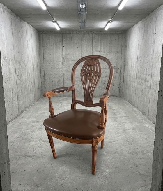 État : Le cuir est en excellent état. Le bois présente quelques marques superficielles mineures, normales pour l'âge et le caractère de ce fauteuil. Il manque un petit morceau de bois au monogramme.