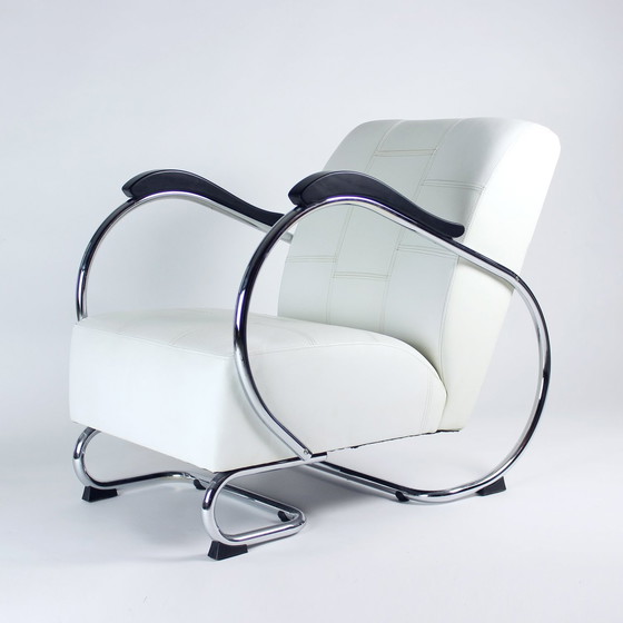 Fauteuil de salon unique après une restauration complète. Le fauteuil a été produit dans les années 1930, conçu par Hynek Gottwad. Le fauteuil offre un grand confort d'assise. Le design est unique en son genre. La construction en tubes chromés courbés a été professionnellement nettoyée et restaurée dans une nouvelle finition chromée. Les repose-mains sont en bois de chêne avec une nouvelle finition noire. Le revêtement est en cuir blanc pur dans un style intéressant de finition en patchwork. Magnifique cuir italien. Chaise très confortable avec un design unique. Nous avons encore 10 de ces chaises disponibles pour une nouvelle tapisserie. N'hésitez pas à nous faire savoir si vous êtes intéressé par d'autres pièces.