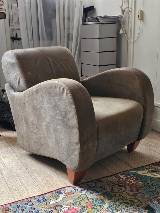 Fauteuil en cuir, coloris gris tabac/brun. Piètement : bois.