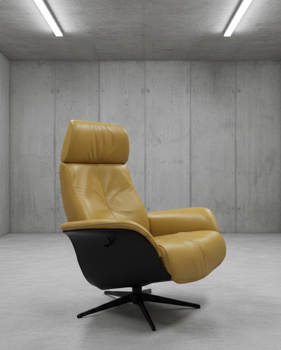 Vous recherchez l'alliance parfaite entre design moderne et confort absolu ? Ce fauteuil est confectionné en cuir jaune ocre de haute qualité, avec une élégante coque extérieure noire, pour un style contemporain et luxueux.
