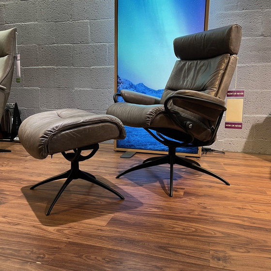 Fauteuil inclinable Stressless Tokyo – Dossier haut. Envie de luxe et de confort ? Ce fauteuil inclinable Stressless Tokyo, avec son dossier haut et son piètement surélevé, offre le meilleur des deux mondes : un design raffiné et un confort d’assise inégalé. 🔹 Revêtement : Cuir de haute qualité 097 Pioneer – coloris 12 Gris – élégant, doux et résistant. Ce cuir aniline à surface ouverte se patine avec le temps et présente des marques d’usure inévitables. Les goûts sont subjectifs, mais personnellement, nous le trouvons très charmant. 🔹 Dossier : Dossier haut avec appui-tête réglable en hauteur – pour un soutien parfait de la nuque et de la tête. 🔹 Piètement : Élégant piètement étoile 45 en noir mat – finition moderne et épurée. 🔹 Inclus : Repose-pieds surélevé assorti – pour une relaxation complète. Ce fauteuil inclinable est réputé pour son ergonomie et son style intemporel. Il est en excellent état. Profitez dès maintenant de son prix compétitif !