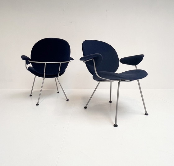 Charmant et confortable fauteuil, modèle Trienale de Willem Gispen pour Kembo Rhenen. Le design date des années 1950, mais il s'agit d'une copie de 2003. Le fauteuil a une structure en acier et un revêtement bleu foncé. Les chaises sont offertes séparément et sont en bon état avec de légères traces d'utilisation. Une pièce intemporelle du design hollandais ! Prix par chaise.