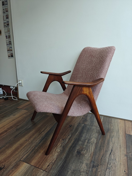 Magnifique fauteuil Louis van Teeffelen, entièrement retapissé : mousse et tissu neufs. Ce fauteuil en forme de A, comme vous pouvez le constater grâce à ses pieds, possède un dossier légèrement incliné pour un confort d'assise optimal. Le tissu est d'une douceur exceptionnelle. Il s'intègre parfaitement dans un intérieur contemporain, vintage, rétro ou moderne du milieu du siècle.