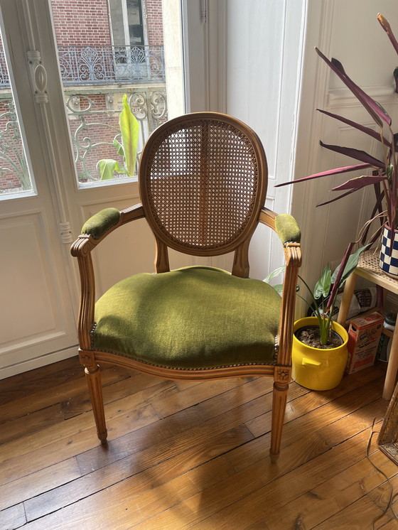 Fauteuil Louis XVI en velours et rotin – Charme intemporel garanti