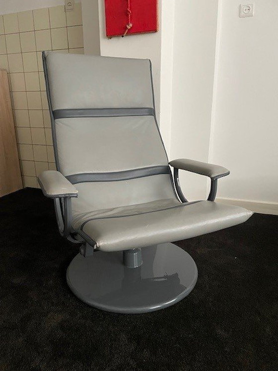 Superbe fauteuil d'Artifort. Designer Wofgang Muller. Revêtement en cuir gris avec des accents gris foncé. Sur une belle base en métal. Le fauteuil a un dossier élastique et une assise inclinable. Le fauteuil est en très bon état.
