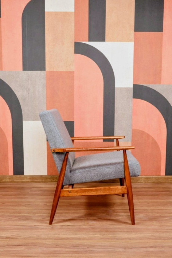 Ce fauteuil a été remis à neuf dans notre atelier. De style scandinave, il a été restauré par des professionnels et recouvert d'un tissu en laine graphite.