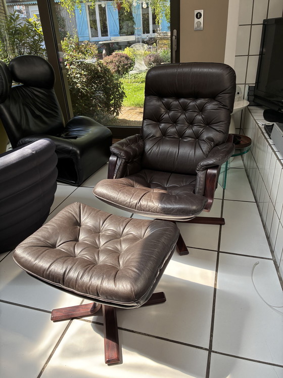 Fauteuil lounge vintage suédois + ottoman — cuir brun, années 70
