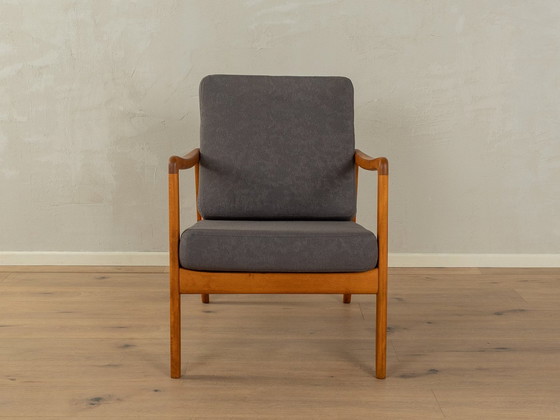 Elégant fauteuil des années 1950 par Ole Wanscher pour France & Daverkosen. Le rare modèle FD-109 présente un cadre en hêtre massif teinté en teck, un dossier ouvert incliné et des pieds angulaires pour une esthétique organique. Le panier à ressorts d'origine a été retapissé et recouvert d'un tissu d'ameublement gris de haute qualité.