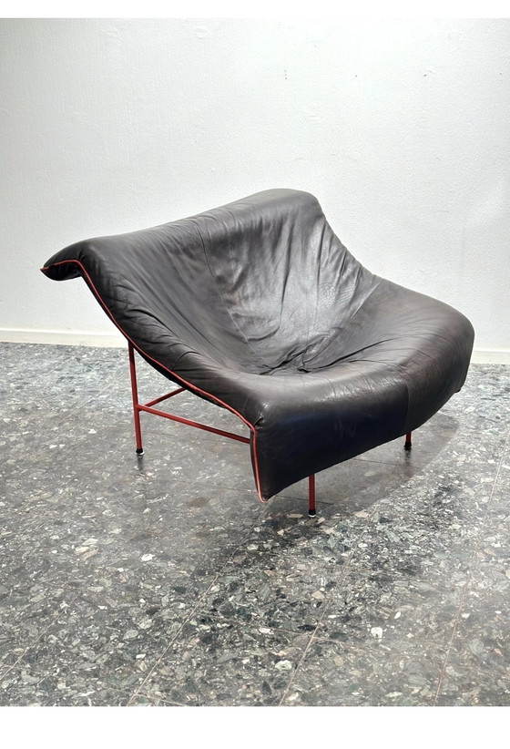 L'assise en cuir noir souple est ornée d'un passepoil rouge et repose sur une structure en métal rouge. Ces accents de couleur confèrent au fauteuil une allure à la fois ludique et élégante. Un véritable accroche-regard qui s'intégrera parfaitement dans les intérieurs modernes ou plus classiques.