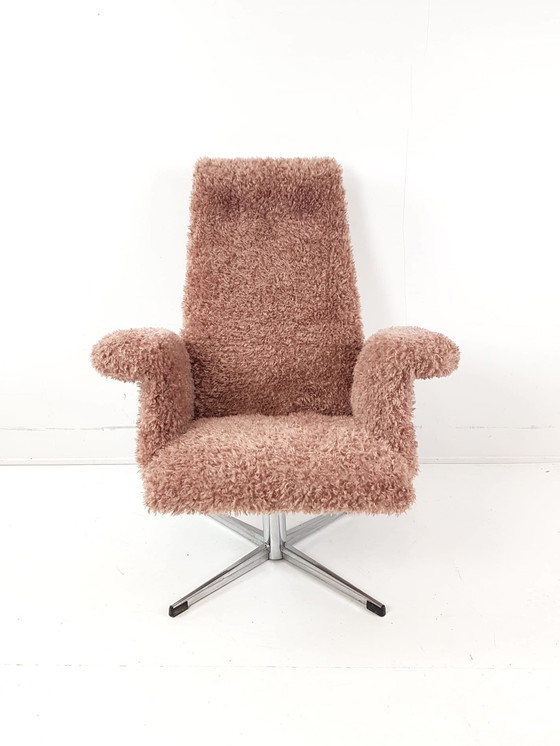 Fauteuil pivotant vintage, récemment retapissé de tissu rose à motifs.