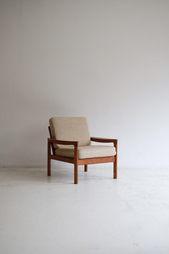 Fauteuil pour Komfort Møbelfabrik, modèle des années 1950. Structure en teck, coussins recouverts d'un tissu de laine épaisse. Canapés 3 et 2 places disponibles dans le même modèle.