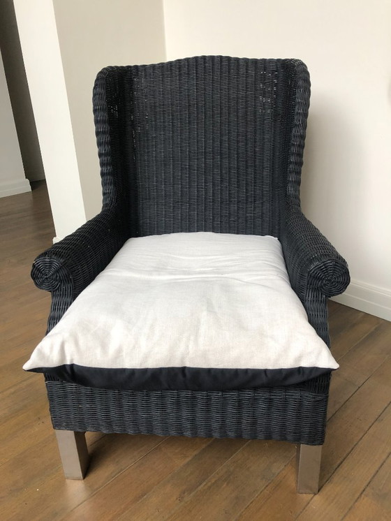 Fauteuil relaxant en osier noir et piètement en acier inoxydable.