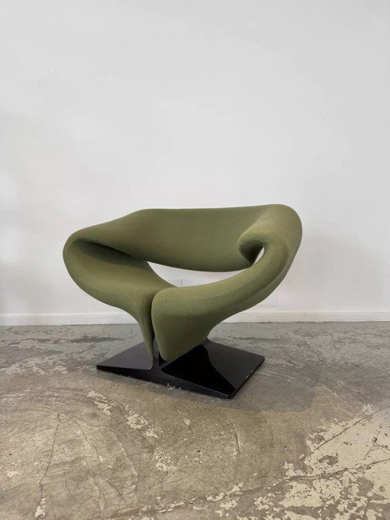 Son revêtement en tissu vert foncé, récemment et méticuleusement refait, accentue la sensualité de ses lignes et la profondeur de ses courbes. Reposant sur un piètement, le fauteuil semble flotter, tout en offrant un soutien ergonomique. Véritable œuvre d'art fonctionnelle, le fauteuil Ribbon reflète la vision avant-gardiste de Paulin : transformer le mobilier en sculpture, en plaçant le corps au cœur de la forme.