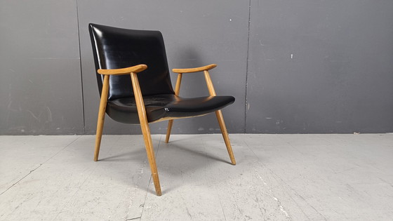 Fauteuil en bois du milieu du siècle avec assise en simili-cuir noir nouvellement tapissée.