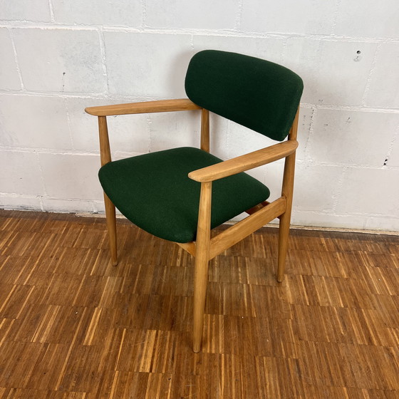 Magnifique fauteuil avec un cadre en bois robuste fini avec une assise et un dossier en tissu vert. La structure en bois est en bon état, les parties en tissu sont également en bon état et il n'y a pas de déchirures dans le tissu.