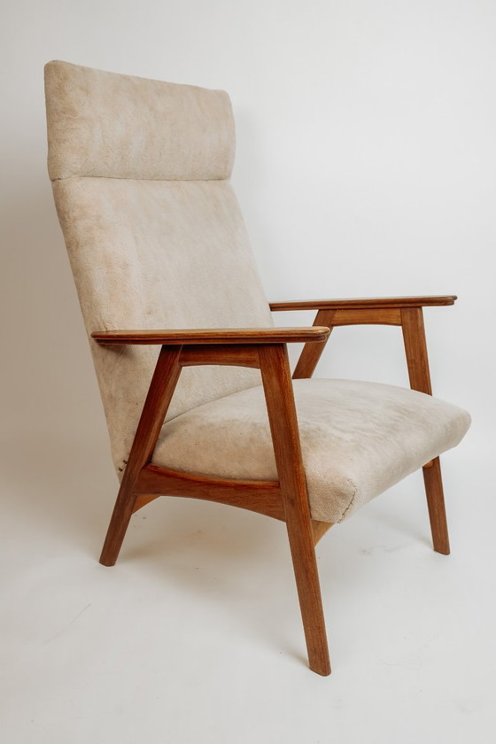 Magnifique fauteuil des années 1960. Sa structure est en teck et il est doté d'accoudoirs et d'un haut dossier.
