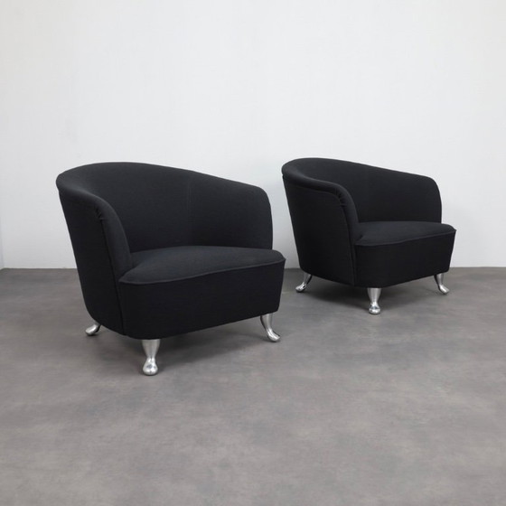 Le modèle Classico se caractérise par sa forme enveloppante et légèrement incurvée, offrant à la fois sérénité visuelle et un confort exceptionnel. Récemment retapissés d'une laine noire de haute qualité, ces fauteuils mettent en valeur leur présence sculpturale tout en préservant la pureté du design original. La texture subtile de la laine contraste harmonieusement avec les lignes fluides et épurées de la silhouette. Leurs pieds en métal distinctifs, réalisés par Custos, ajoutent une touche architecturale raffinée et confèrent aux fauteuils une allure légère et élancée.