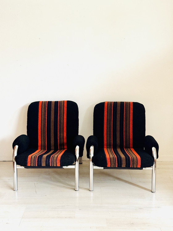 Ces fauteuils sont en excellent état. Le chrome est magnifiquement poli et le tissu est en bon état, avec de légères traces d'usure normales pour son âge. Dimensions : 70 cm (largeur) x 80 cm (profondeur) x 70 cm (hauteur) x 37 cm (largeur).
