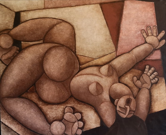 Découvrez la puissance expressive de « Femme nue allongée de style moderne », une huile sur toile de l'artiste amstellodamoise Ylle Dekker. Cette œuvre combine formes angulaires et arrondies dans un style moderne inspiré de Picasso. Les tons chauds de brun et de terre cuite lui confèrent profondeur et émotion, en faisant une pièce maîtresse saisissante dans n'importe quelle pièce. Le tableau est encadré d'une fine caisse américaine noire.