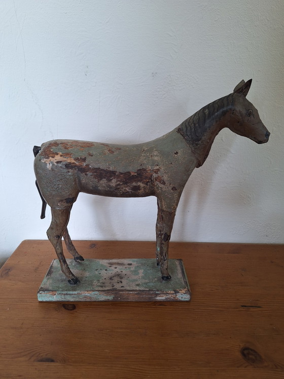 Adorable figurine ancienne en bois représentant un cheval. Queue mobile en métal. Peinture polychrome et patine.
