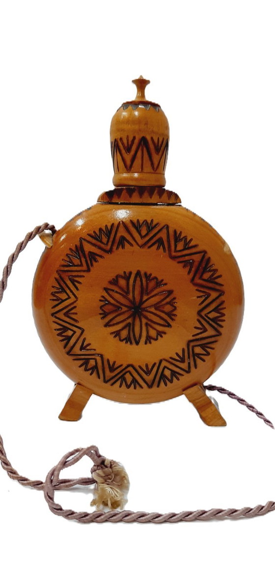 Cette exquise flasque vintage en bois roumain témoigne de l'art de la pyrogravure. Mesurant 20 cm, elle présente des motifs complexes reflétant un savoir-faire traditionnel. Les tons bruns chaleureux du bois sont magnifiquement mis en valeur par les motifs détaillés, ce qui en fait une pièce décorative remarquable pour toute collection.