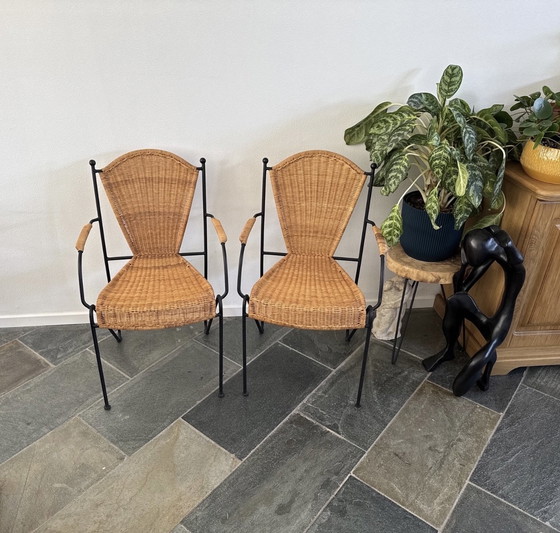 Les chaises vintage sont dotées d'une belle assise et d'un dossier en rotin, soutenus par un cadre métallique robuste. Le design est une représentation parfaite du style Mid Century Modern, idéal pour les intérieurs modernes et classiques.