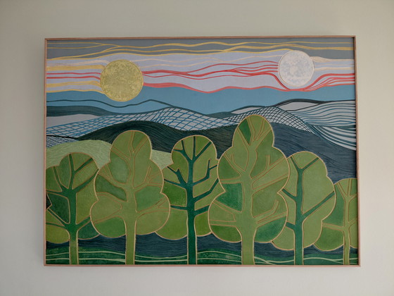 Laissez-vous transporter dans un monde serein avec l'œuvre « Rêve de forêt ». Cette magnifique pièce capture l'essence d'un paysage forestier onirique, où le soleil et la lune se conjuguent dans le ciel. Les teintes vertes éclatantes des arbres contrastent harmonieusement avec les vagues bleues et rouges du ciel, créant une scène à la fois dynamique et apaisante.