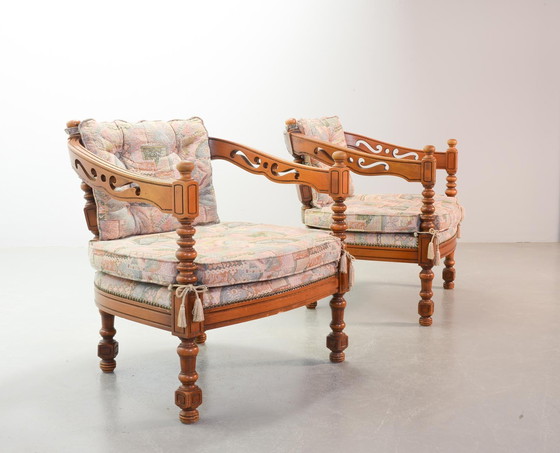 ÉtatTrès bonCouleursMarron, MulticoloreMatériauBois, TextileQuantité2StyleVintageMarqueGiorgettiHauteur67 cmLargeur65 cmProfondeur68 cmHauteur d'assise38 cm