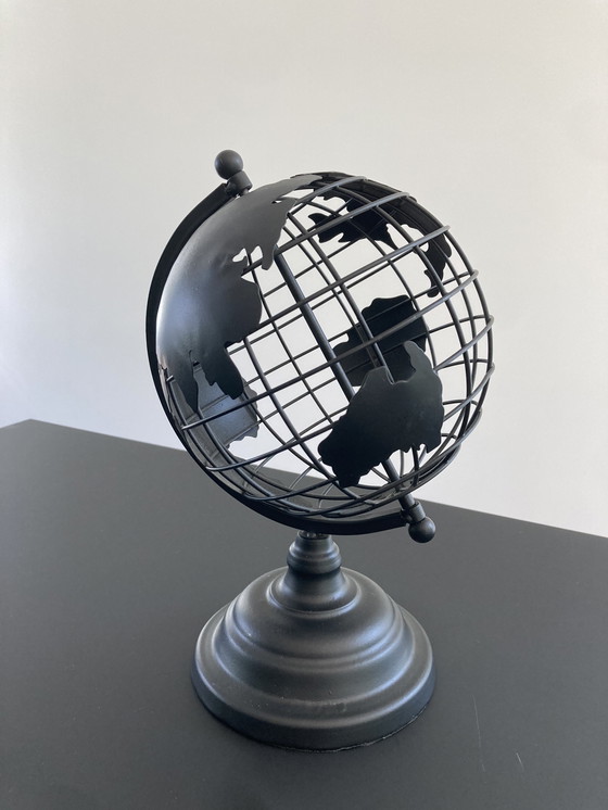 Ce globe moderne est un ajout décoratif élégant à tout intérieur. Fabriqué en métal durable, il présente une finition noire élégante qui lui confère un aspect contemporain. Le design ajouré avec les continents en métal (il manque l'Europe !) ajoute une touche unique et artistique au globe traditionnel. Parfait pour un bureau, une étagère ou comme point focal dans une pièce.