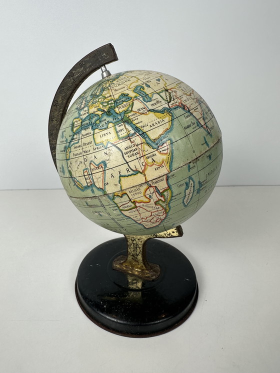 Globe terrestre vintage en métal. Marque : Reliable Series. Fabriqué en Angleterre. Version anglaise. Comprend un rapporteur. Idéal pour la décoration. Belles couleurs pastel. Diamètre : 12 cm. Hauteur : 20 cm. Poids : 170 g