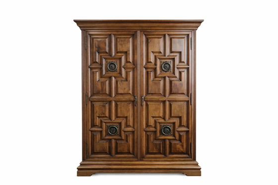 Ce buffet est réalisé en bois massif et présente des portes à panneaux géométriques finement sculptés, ornées de poignées anneaux en métal. Un travail artisanal de grande qualité, pour un style classique et chaleureux.