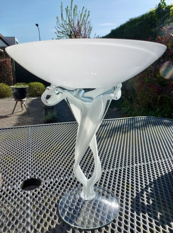 Ce bol en verre soufflé à la bouche présente un pied torsadé caractéristique et une base blanche en forme de bol. Créé par Jozefina Krosno en Pologne dans les années 1980, il est souvent appelé bol « Poulpe » ou « Méduse ».