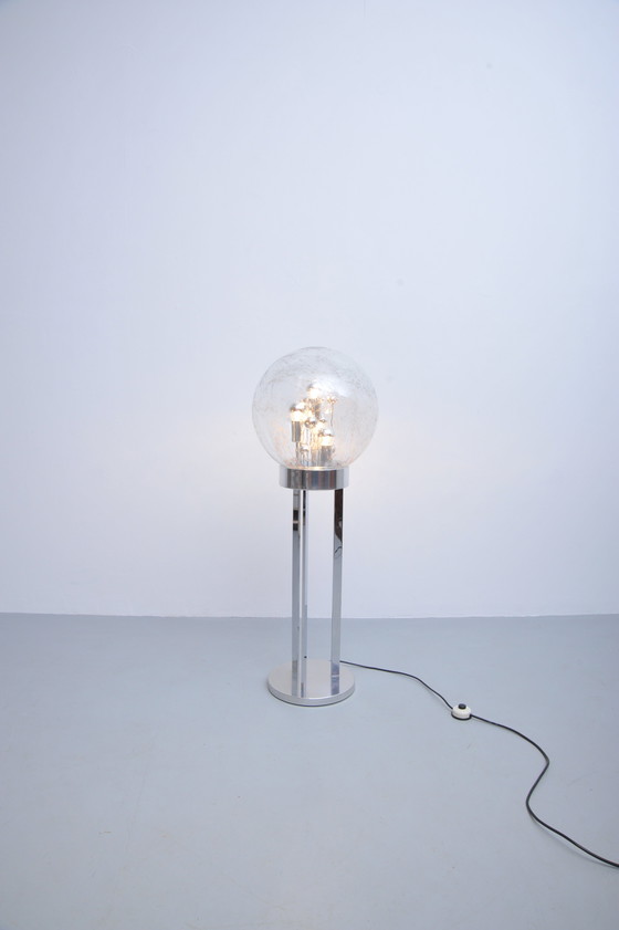 Grand lampadaire de Doria Leuchten. La grande boule en verre est amovible, ce qui permet de changer les ampoules. La structure métallique est chromée.