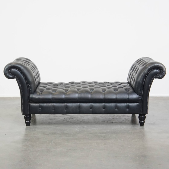 Offrez ce grand lit de jour Chesterfield noir orné, en cuir de vachette, à l'aspect intemporel et majestueux.